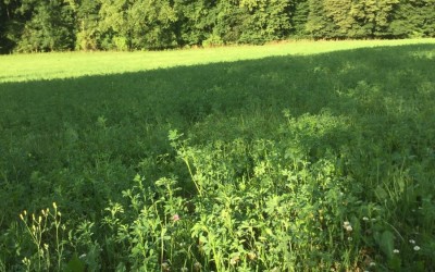 Auch auf den Ackerflächen finden zahlreiche umweltschonende und nachhaltige Produktionsverfahren Anwendung (AL.3-Maßnahmen: Umweltschonende Produktionsverfahren des Ackerfutter- und Leguminosenanbaus (Reinsaat oder Gemische von Gräsern, Leguminosen oder anderen Futterpflanzen) oder Körnerleguminosen). So nutzen wir seit Jahren den Anbau von Körnerleguminosen (Erbsen) und stickstoffsammelnden Ackerfutterpflanzen (Kleegras und Luzerne) zur Futtergewinnung. Neben hochwertigem Eiweißfutter liefern diese Pflanzen viel Biomasse und tragen zu einer deutlichen Auflockerung der Fruchtfolge bei. In Kombination mit dem Anbau von Zwischenfrüchten fördern die Eiweißpflanzen die Verbesserung der Bodenfruchtbarkeit und minimieren die Erosion.